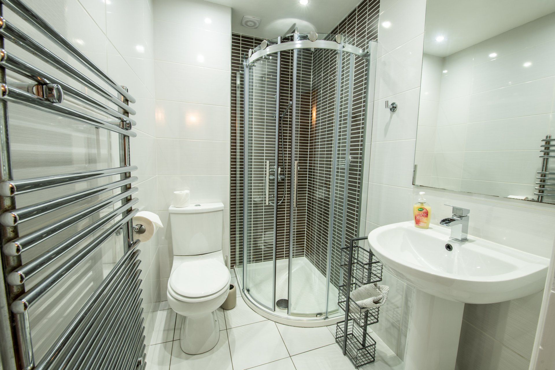 There is a fitted shower room containing a great shower with both a large top mounted shower head and a hand held shower head to revitalise you after a day out and about. The bedroom has a comfy king size bed and plenty of storage space. There is also a hair dryer for your use. Bed linen is provided and so are towels. There is ample onstreet parking available right outside the apartment which is free at all times.